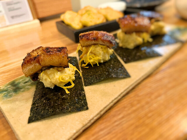 パリッとした海苔・なめらかなポテトサラダ・フワッとした鰻、そこにアクセントとしてお好みで山椒を。