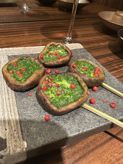 串焼きでは自家製つくねのパルミジャーノがチーズ好きには堪らない!生しいたけのエスカルゴバターは新しい味わいで感動的✨極上レバーともも正肉も絶品で、特にもも正肉のタレが絶妙でした。そして、ベーコン巻きチーズはワインにぴったり!