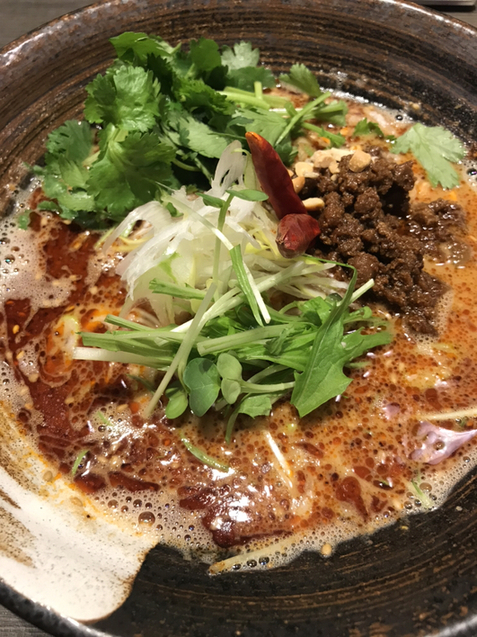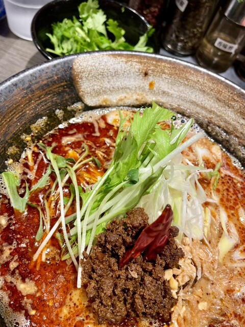 烈火担々麺(赤)細麺ストレート。店のおすすめは中細ちぢれだけど細麺が断然美味い。