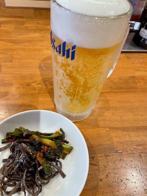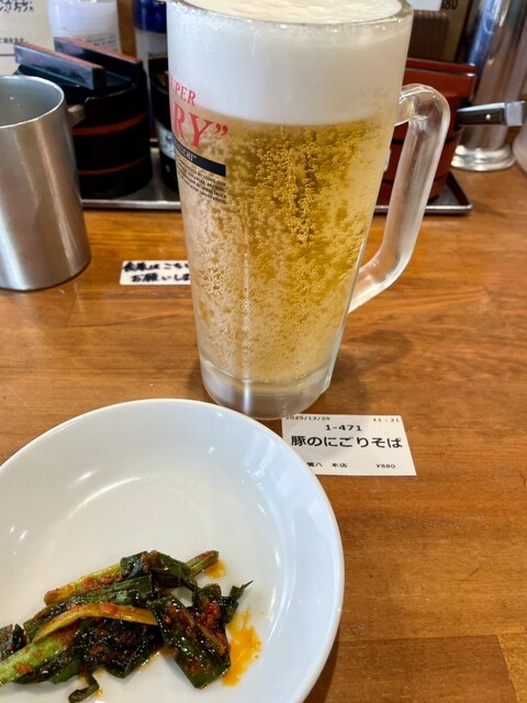 生ビールと、豚の濁りそば、九条ネギトッピング。