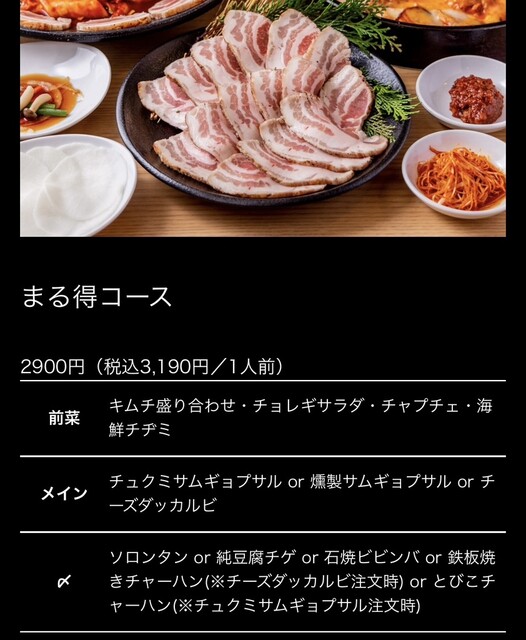 前菜のキムチ盛り、サラダ、海鮮チヂミ、チャプチェ、サムギョプサル(選んだメインの料理)、ソルロンタン(選んだ締めの料理)、梨ジュースというコースになっていて、色々な料理が少しずつお得に食べられるところが嬉しいポイントです^^