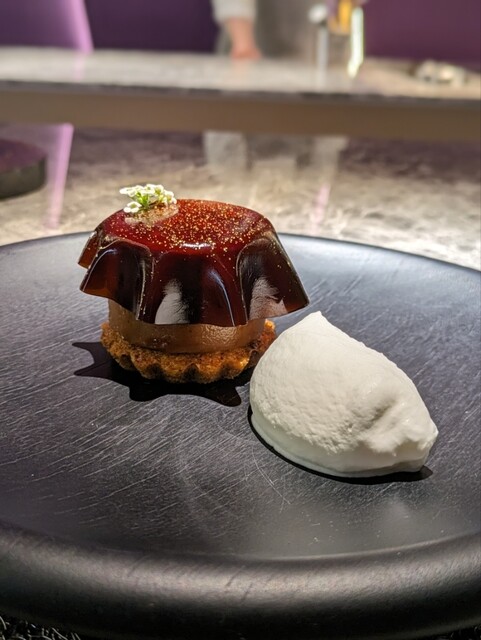 京都丸茄子、発酵トレバス(黒にんにく、ビーツ)鴨肉の内臓を熟成させたソース