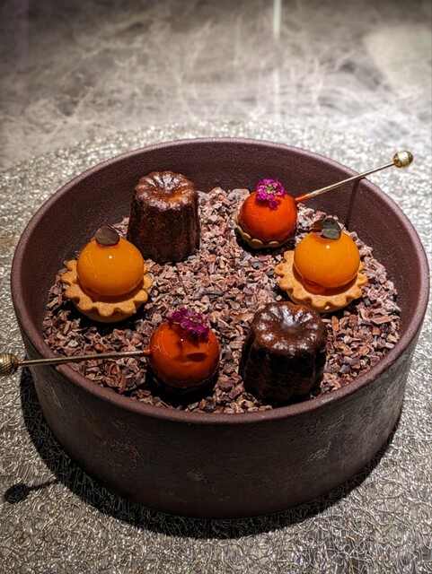 上の球体はチョコレート、ナッツペーストと合わせた物