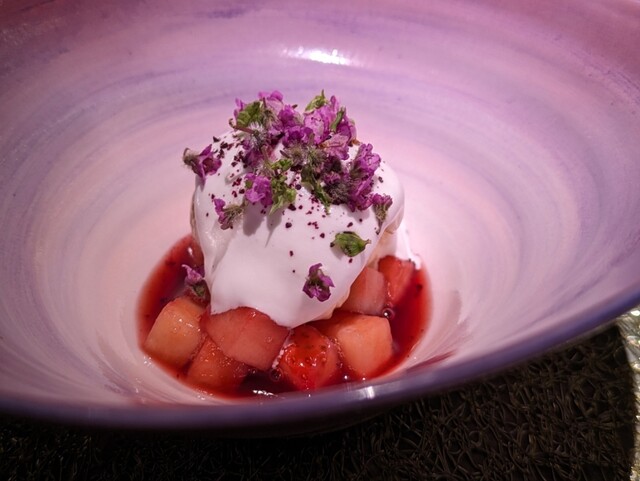 ストラッチャテッラ、鬼灯、白いガスパチョソース、オレンジのパプリカ、チョリソーのソース、青いハーブのオイル、ナスタチウムの花