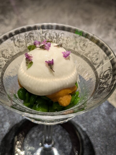 グラスの中には北海道の紫雲丹がたっぷりと新たまねぎのエスプーマ