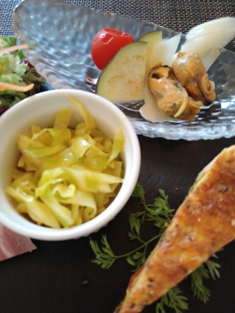 三浦野菜のサラダやマリネやピクルス。酸味が丁度良く素材の味が生きてます。ムール貝のマリネは旨味が凝縮され濃厚。