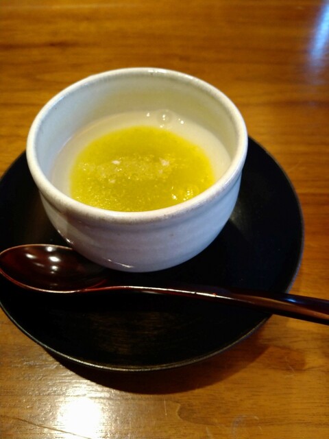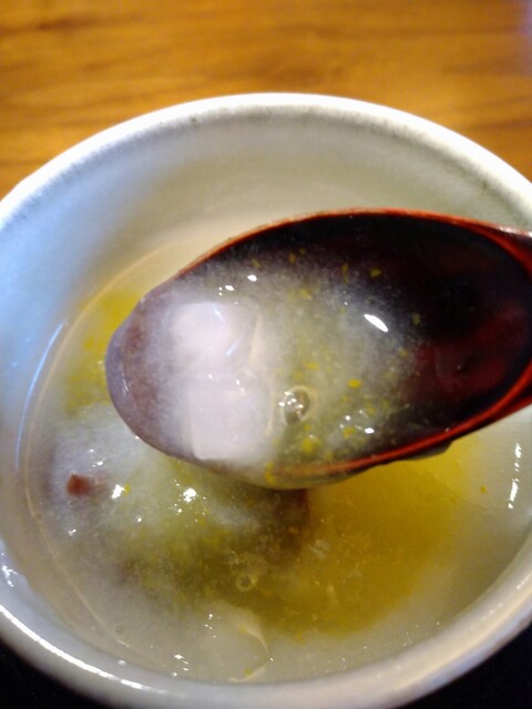 デザートにも。柚子の重湯。中には小豆餡。そして、小さな賽の目の大根は塩味。絶妙な加減のカリっとした食感と塩っぱい大根は、思い付かないような存在感。