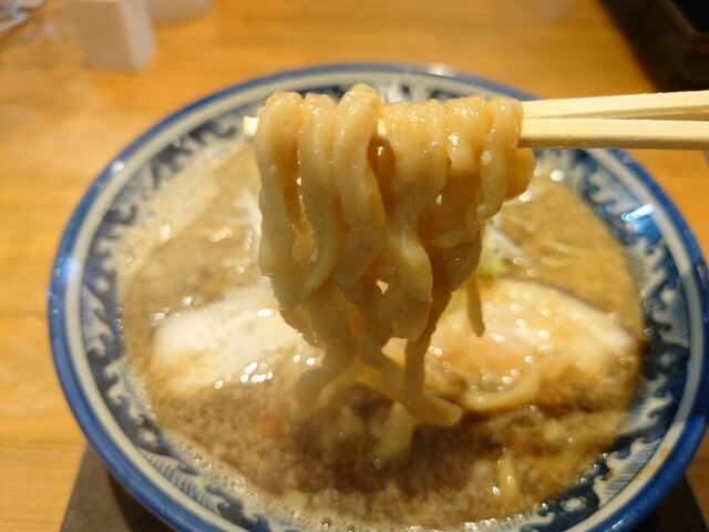 極太の縮れ麺も適度にしっかりとした弾力と小麦の香りで食べ応えがある。スープとの相性も抜群だ。