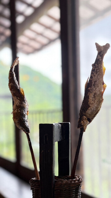 囲炉裏でじっくり焼き上げられた川魚等々