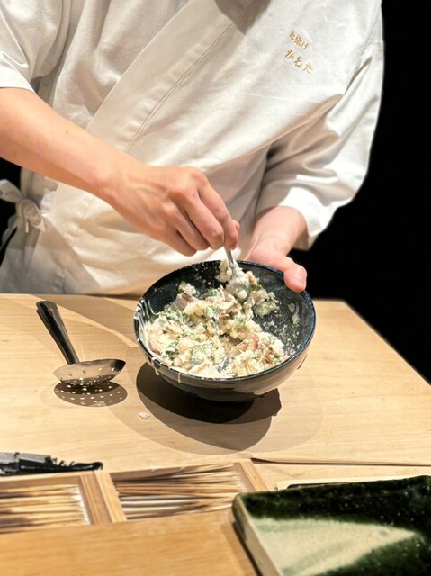 極細の海蘊はするりとほどけるような食感で、水晶のように透明感のある文旦の甘苦さと見事に溶け合う一皿。三杯酢の酸味がやさしく全体をまとめ、串揚げのコースの幕開けとして心と舌をすっと整えてくれます。
