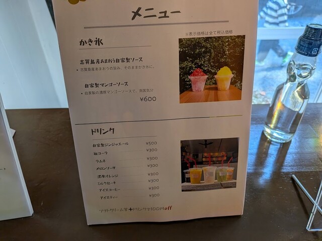 メニューは、牛乳ソフトが600円からで、各種ソースがあって+100円です。フロートは+150円ですね。かき氷は600円。ソフトドリンクは300円からありました。