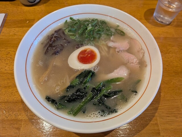 ネギにメンマにチャーシューの他に、ほうれん草にキクラゲ、味玉半分がはいっていました。