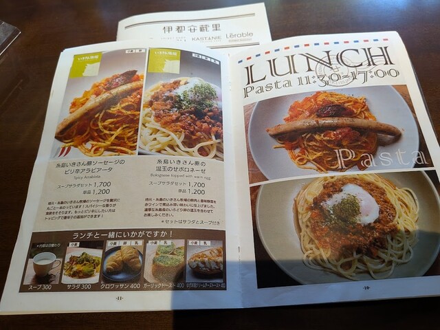福岡県糸島市川付882の伊都安蔵里にある「cafe lily(カフェ リリー)」さんで、糸島いきさん豚ソーセージのピリ辛アラビアータのスープサラダセットをいただきました。(1700円也)