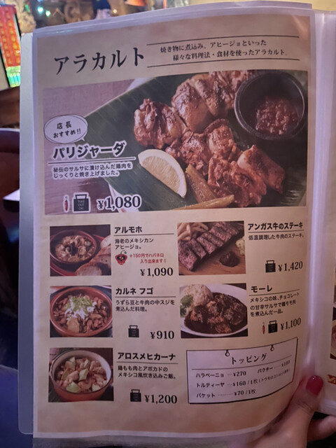 タコスは10種類以上のスパイスや野菜に漬け込んだ豚肉をじっくり焼き上げた定番"パストール"を。