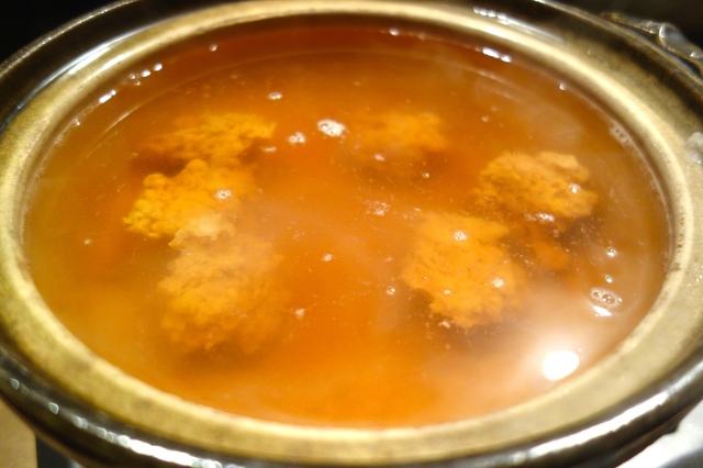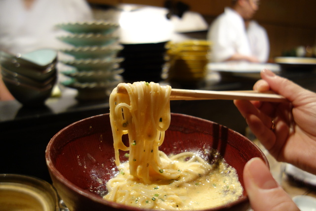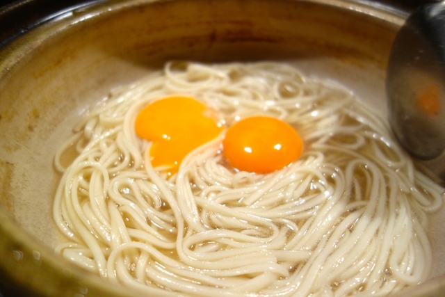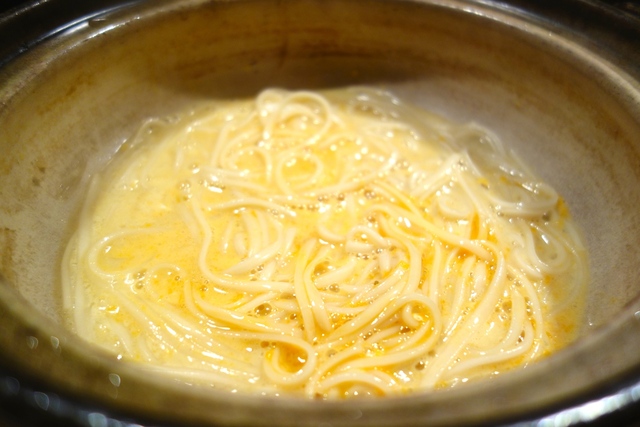鴨鍋・〆の稲庭うどん③:卵黄を投下!