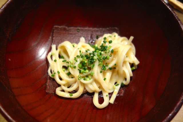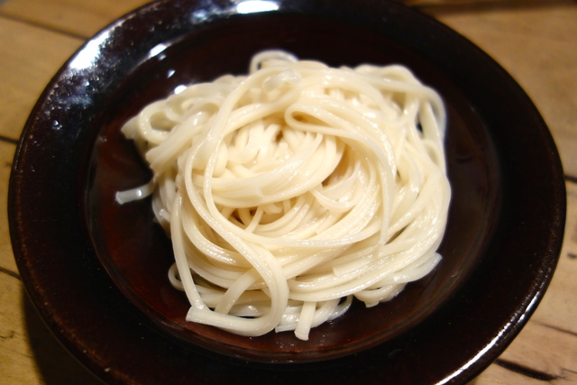 鴨鍋・〆の稲庭うどん①:固茹でした稲庭うどん