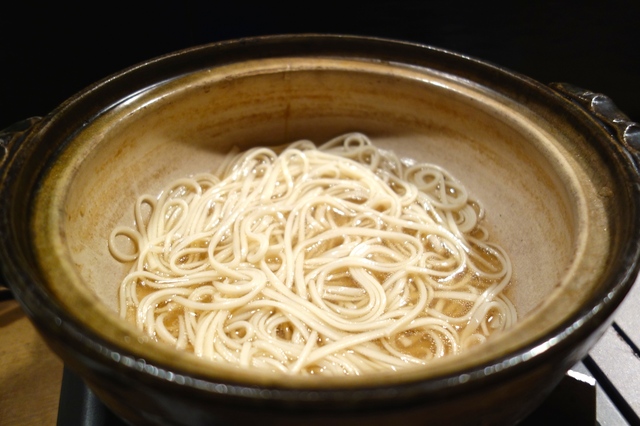 鴨鍋・〆の稲庭うどん②:鍋に投入