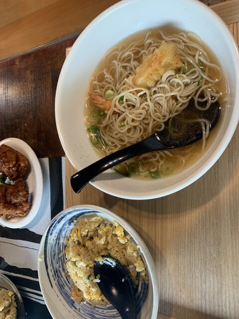 自分は日替わりメニューの、エビ天ソバと半チャーハン、お連れは麻婆豆腐ランチを