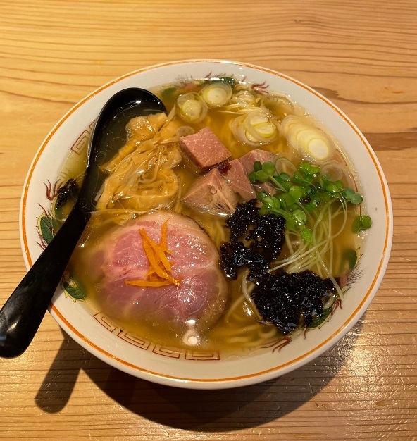 チャーシュー2枚、四角い肉、穂先メンマ、岩海苔、刻みネギ、カイワレ大根、柚子と