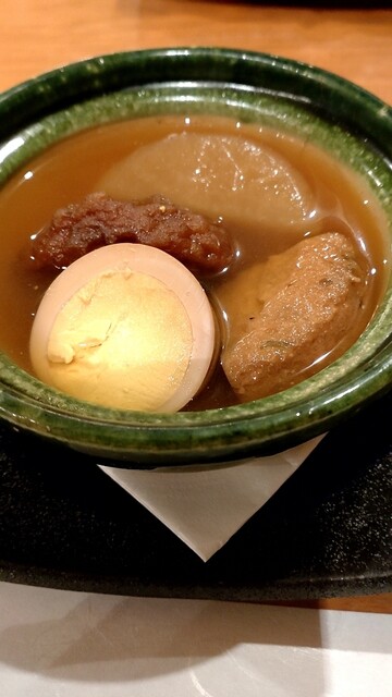 平日にもかかわらず、40代〜50代のサラリーマンの方々が多いのは、静かに食事が楽しめる場所だからでしょうか。最寄り駅から遠い事もかえって一見客を寄せ付けない、常連客のみが知る隠れ家的な雰囲気が有るのでしょう。席の間隔がゆったりしている分、あまり大っぴらに話せない内輪だけの飲食会にも良いのかもしれません。