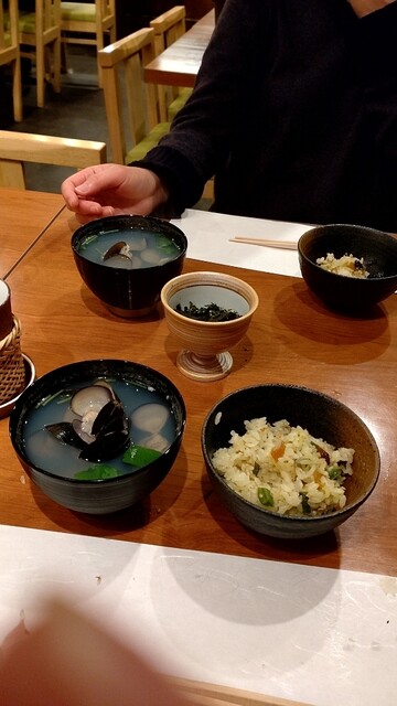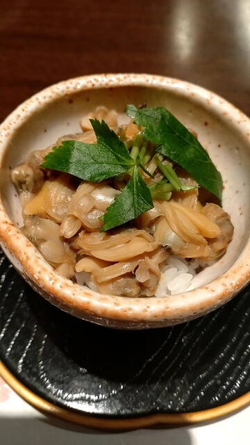名物黒トリュフのご飯は贅沢な香り。ご飯も立っています。出汁入り溶き卵に刻み海苔をまぶして頂きます。青森産シジミはプリップリッで身も大きめ。