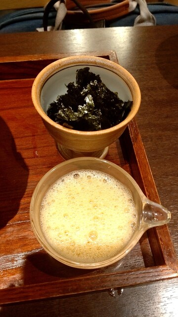 19時前に到着。店内は既に8割程の常連客で賑わっています。席は奥の半個室。初めてなので予約時に季節のお任せコース10千円をお願いしています。