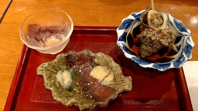 ・前菜 鱧の南蛮漬け、無花果の赤ワイン煮、サザエのつぼ焼き(写真は取り忘れてサザエのみ)