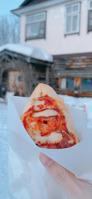 お店でカット+オーブンで焼いていただきました♪噛めば噛むほどのやつ。小麦の甘さを感じる。ソーセージはもちろんケチャップが生地に合う〜ฅ^>ω<^ฅ