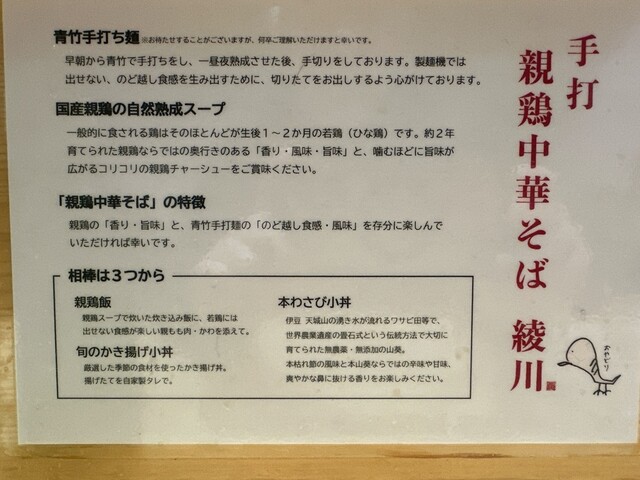 今回は「親鶏味玉中華そば」¥1050と「ミニかき揚げ丼」¥350をチョイス。