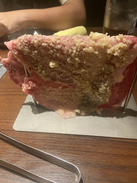 柵に吊るされた一枚肉はニンニクたっぷり付いてますね。ソコソコ厚みも有るよ。豪快にこの一枚肉を焼いていきます。1口食べるともうニンニクでしたね。