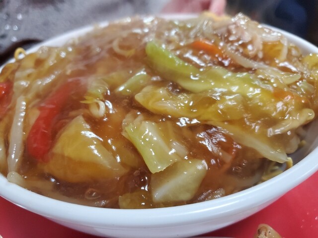 パリッと揚げた太麺に大量の餡掛けがかかった揚げそば。