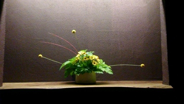 入って、道路側のテーブル席でした。横には、和のおしゃれなお花がいけてありました。