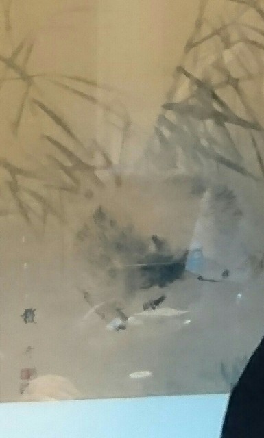 隣のテーブルの向こうの壁を見てみたら、「きつね」の日本画が飾られていました。化かしあい?作者は不明なのだとか。