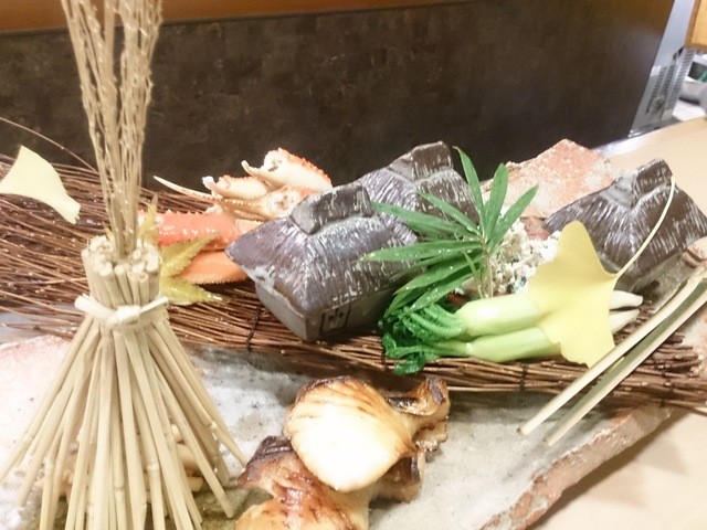 八寸、 山ごぼう、さわら幽庵焼、ズワイガニ、青み大根、法蓮草と柿の白和え、家の器に入っているのは、ナマコ