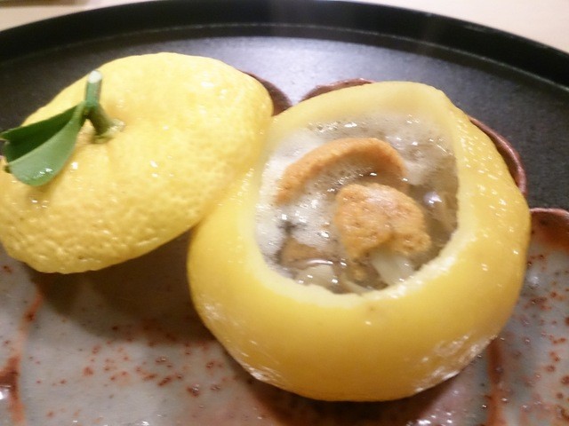柚子の中に雲丹となめこ、コンロで焼いていただきます。