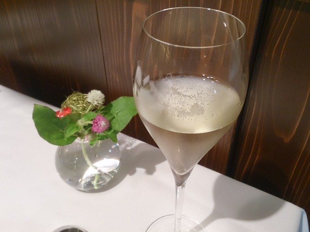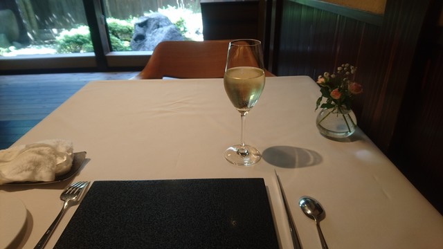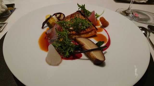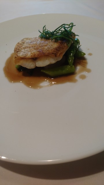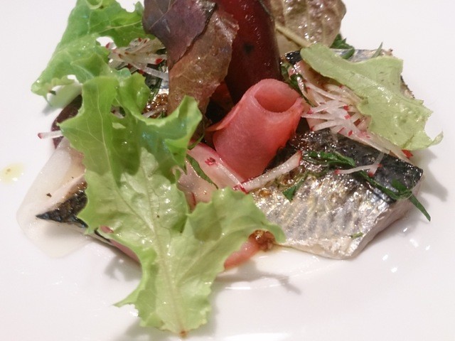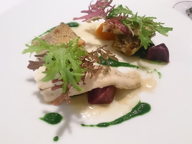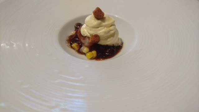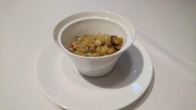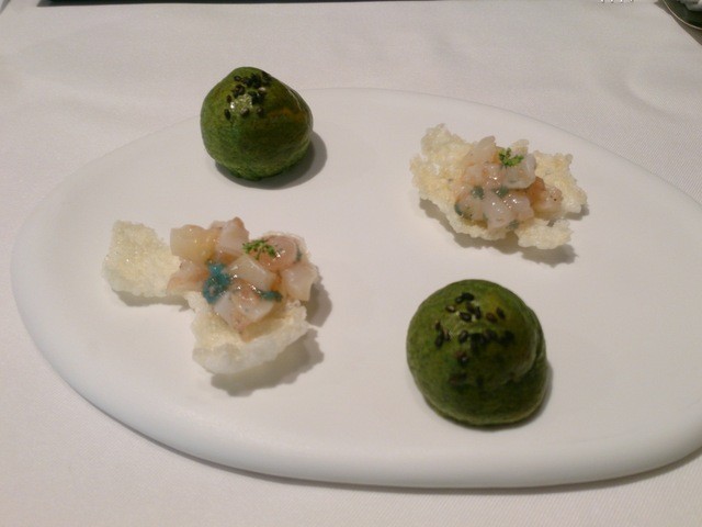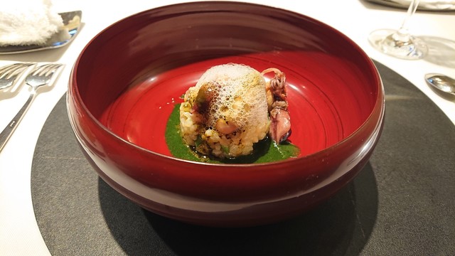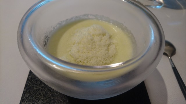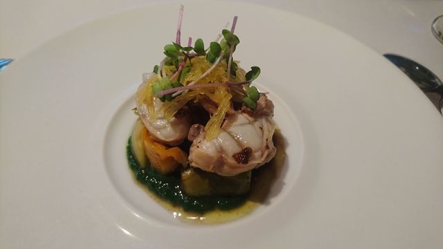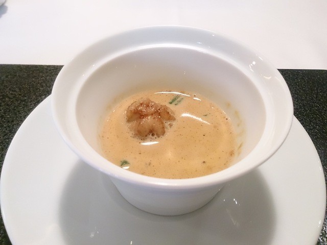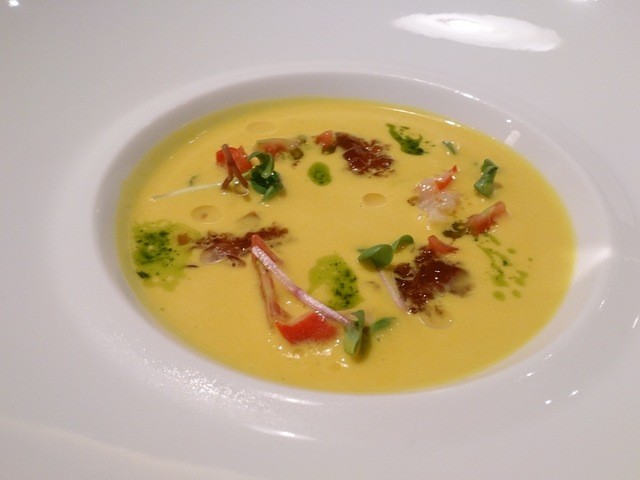 海老のジュレ、赤西貝、バジルもはいったかぼちゃスープ