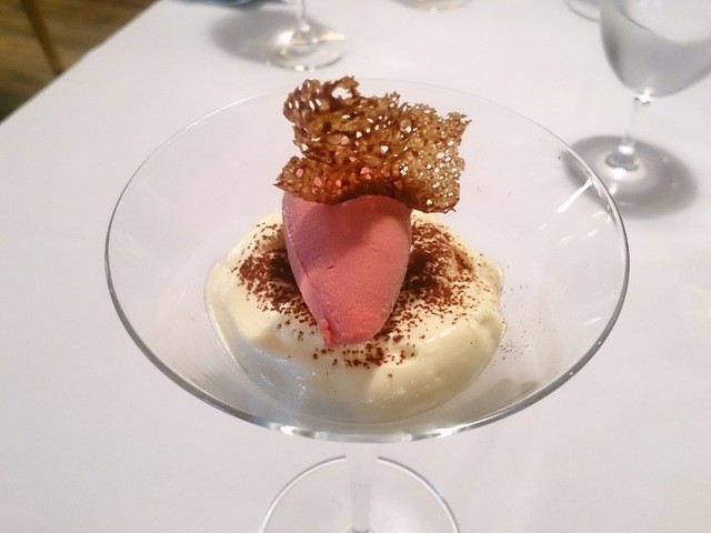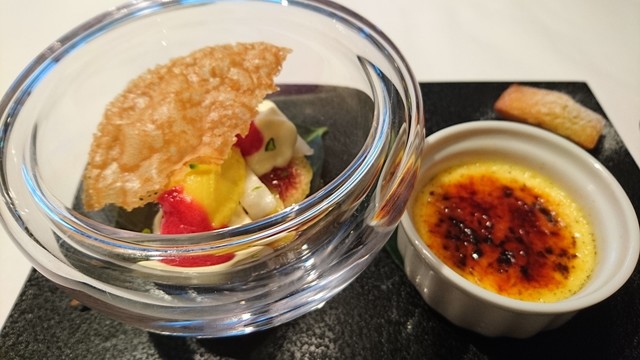 メレンゲ、バナナアイス、ホワイトチョコのムース、パッションフルーツとマンゴーのソース
