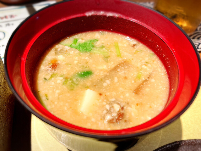 席の前においてある米・麦・豆の自家製ひしおを酒の肴に
