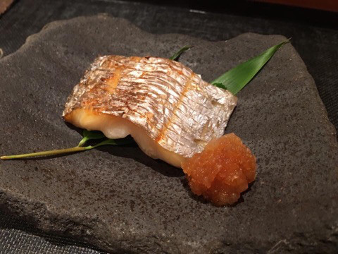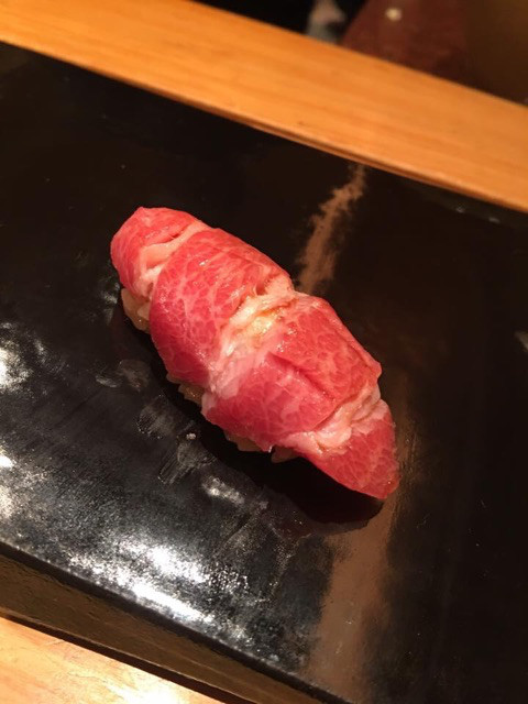 和歌山県産、那智勝浦、のマグロをいただきます。炙る時も、ガスバーナーではなく、熱く熱した石の下で炙ります。香ばしさが全然違う!