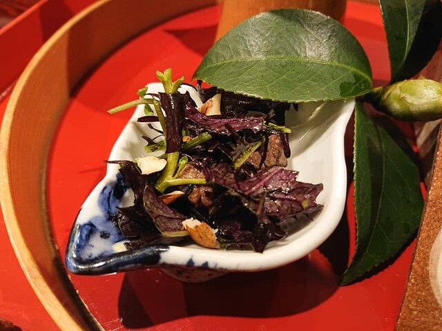 ◯ゆっくり育てた原木椎茸とアスパラ菜の胡麻和え