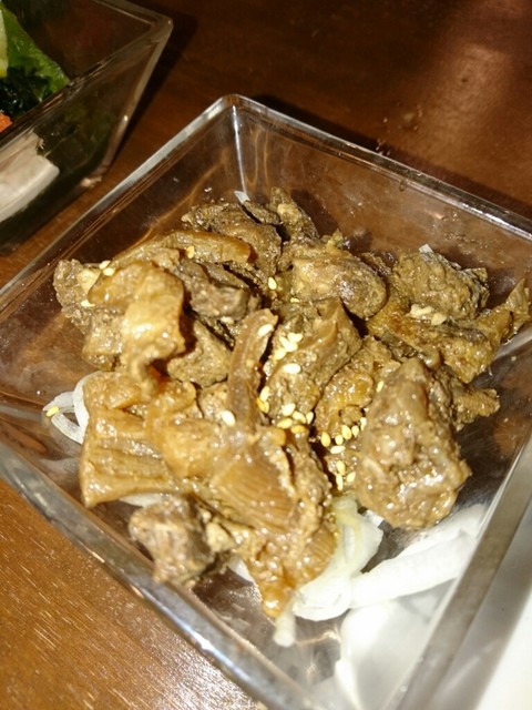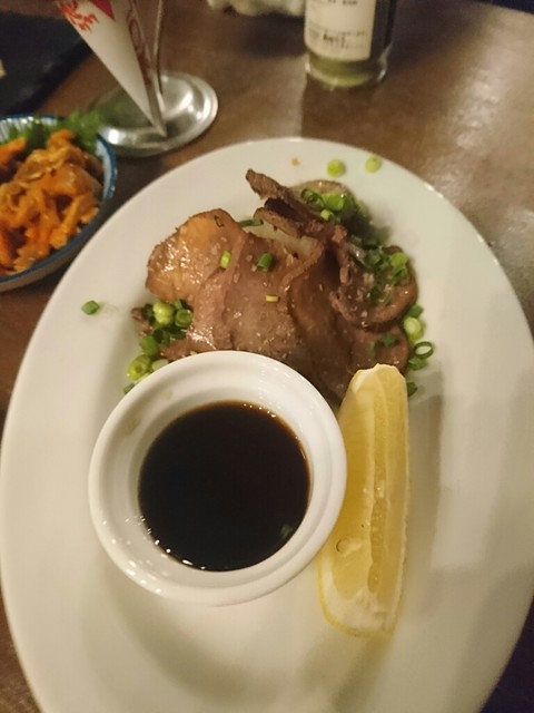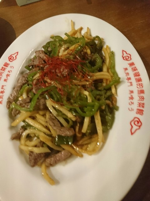 青椒肉絲みたいのと、馬刺しのお寿司。タン。