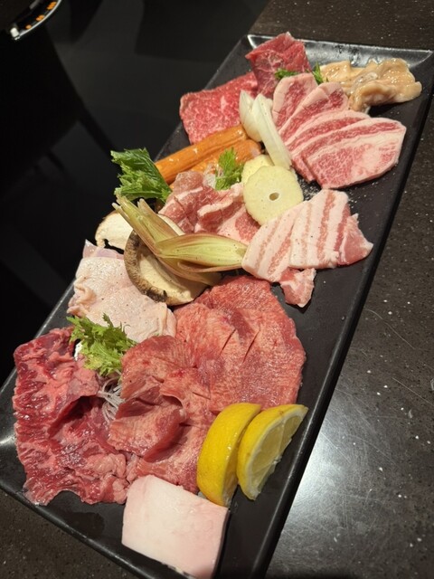 最初にびっくりしたのが、お肉の盛り合わせの豪華さ!「えっ、これが食べ放題のレベルなの!?」ってくらい、一品一品が綺麗で上質。まずは和牛カルビ・ロース・牛タン・ハラミ・豚肉・大山鶏・テッチャン・焼き野菜など、一通りがどーんと出てきて、まるでコース料理のような華やかさ。