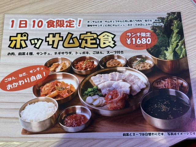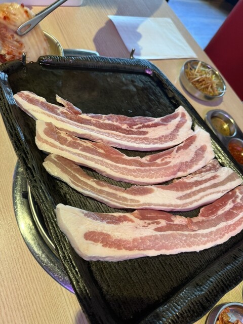 サムギョプサルは店員さんが丁寧に焼いてくれるので、こちらは待っているだけでOK。香ばしく焼き上がったお肉をキムチや薬味、サンチュと一緒に巻いて食べると、本場さながらの美味しさで大満足でした。