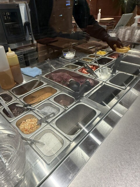 今回は「スペシャルアサイー(ヨーグルトベース)」を注文しましたが、アサイーはシャーベットのようにひんやり滑らかで甘さもしっかり。バナナ・いちご・ブルーベリー・パイナップル・キウイなどのフルーツがたっぷり乗っており、見た目以上に満足感がありました。蜂蜜もたっぷりで最後まで飽きずに食べられます。