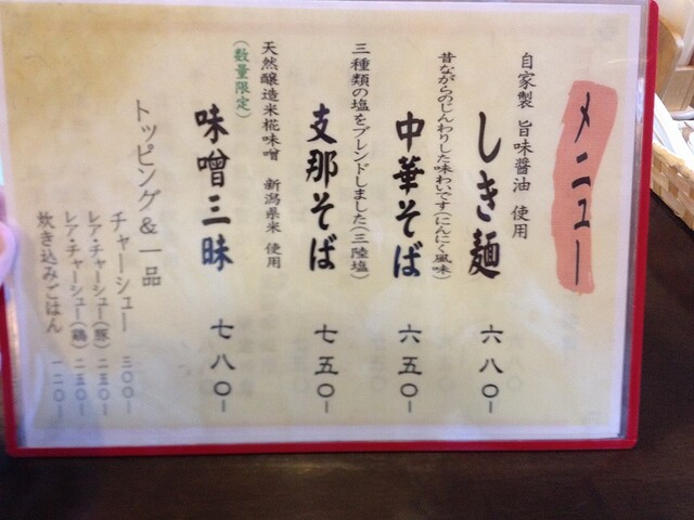 らーめんメニュー(消費増税のせいで若干値上げ)