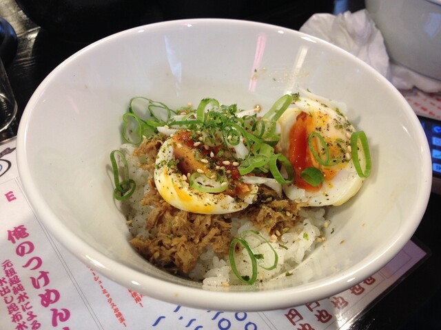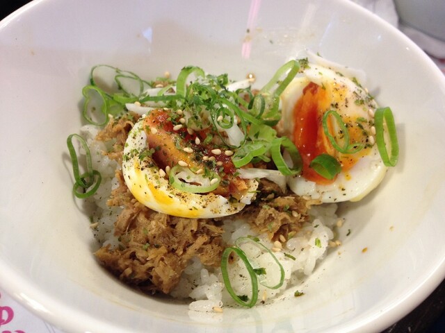 ごはんに敷き詰めてあり、味玉を割り入れ調味料、タレをふりかけた一品!