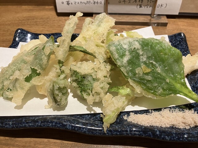 うるい、ふきのとう、エシャレット、スナップエンドウ、コゴミが2つずつ出されています。