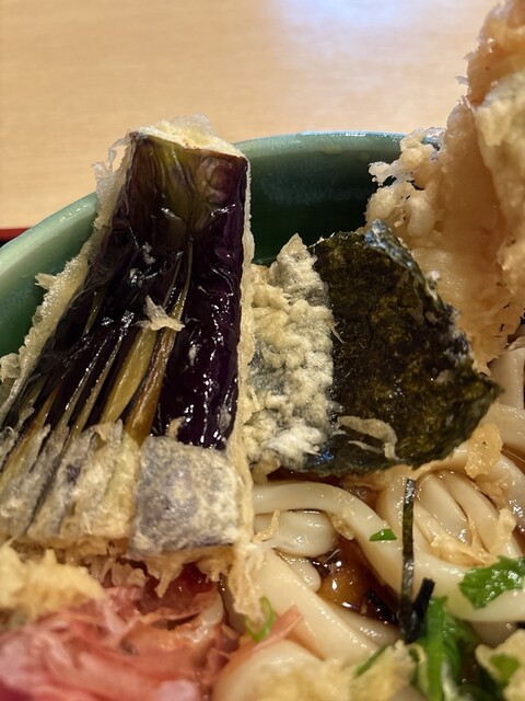 大き目の器に太いうどんと天ぷらにかやくご飯