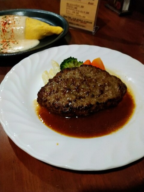 お店は地下にあります。テーブル席について、注文、オムライスホワイトソースに単品ハンバーグ。