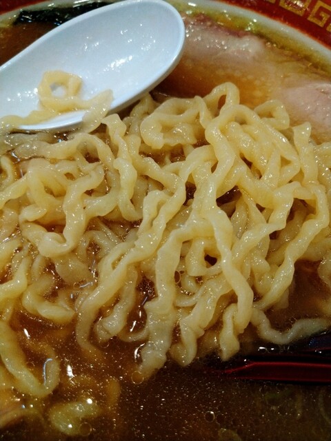 麺は平打ち縮れ麺。スープが絡んで、風味と旨味を呼ぶ感じで美味い。